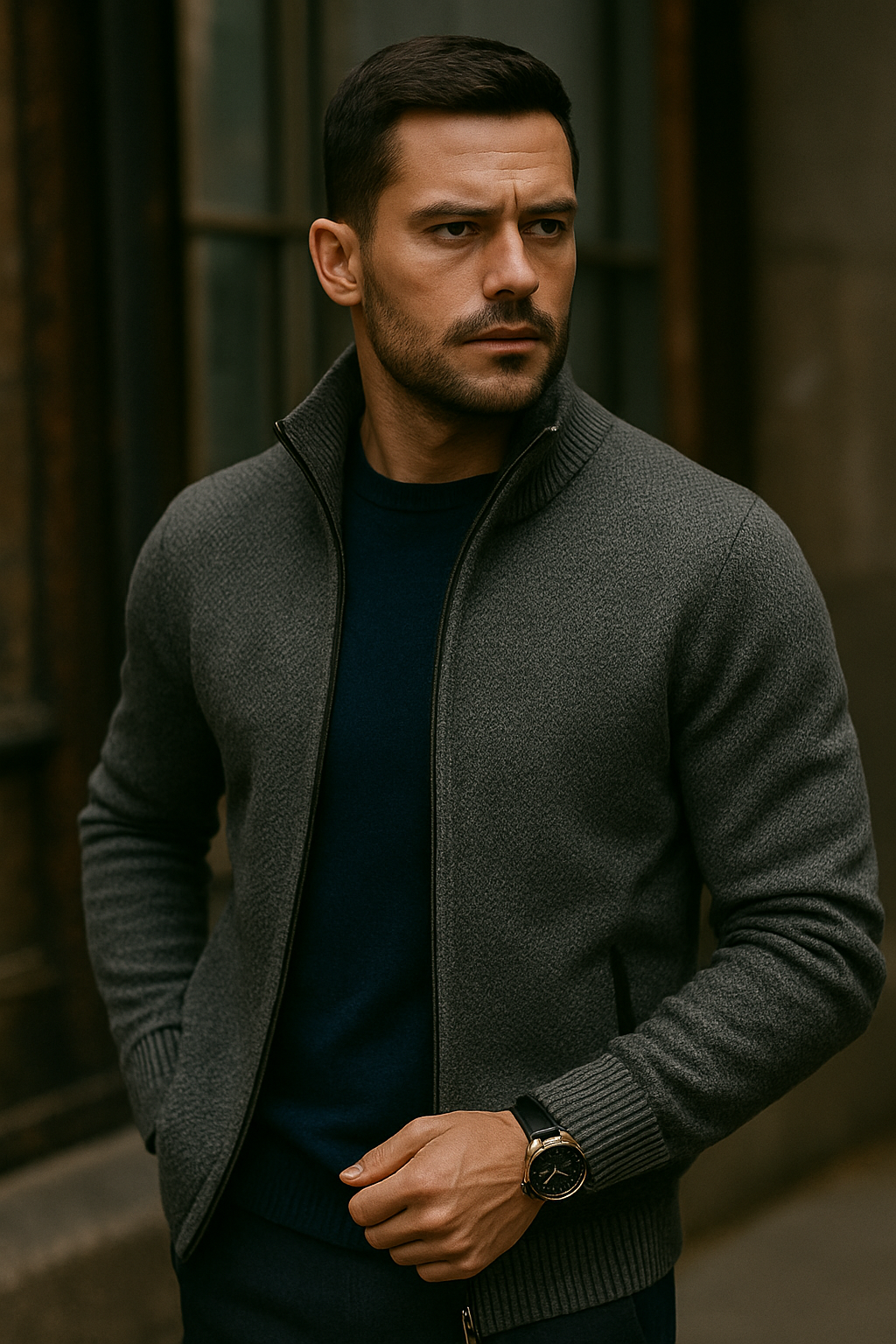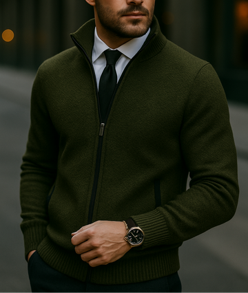 The Veluxer Highland Knit Jacket embodies the essence of modern luxury fused with metropolitan confidence. Designed for men who navigate the cold with effortless composure, this piece merges the warmth of classic knitwear with the sharp elegance of urban tailoring.